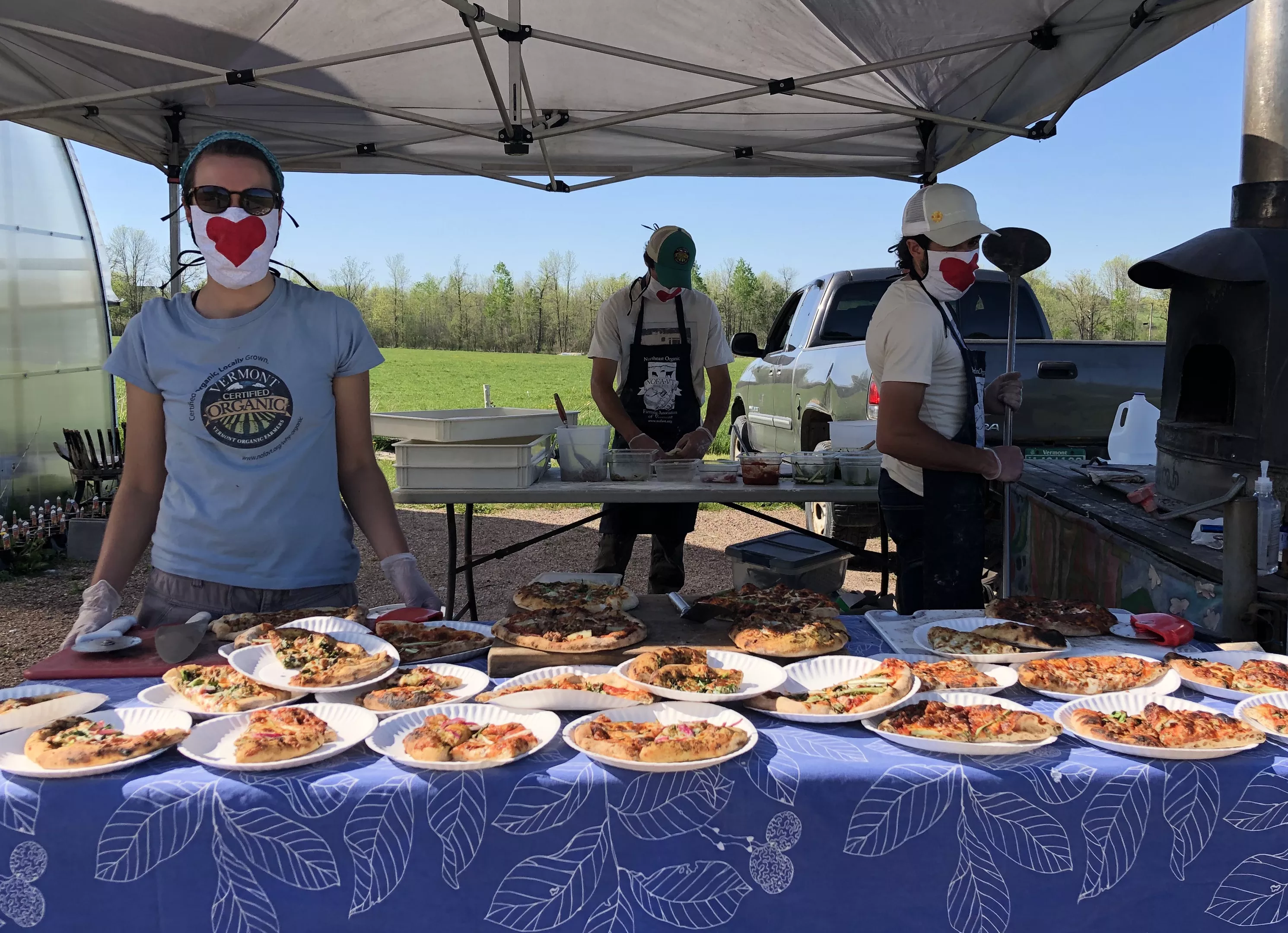 On Friday afternoon, she was busy prepping 50 pizzas with NOFA-VT's longtime pizza master Tucker Levy and volunteer Nick Kierstead. They were feeding the crews of Hinesburg's Red Wagon Plants and Family Cow Farmstand, as well as employees from nearby Trillium Hill Farm and Full Moon Farm who were picking up their pies curbside.
