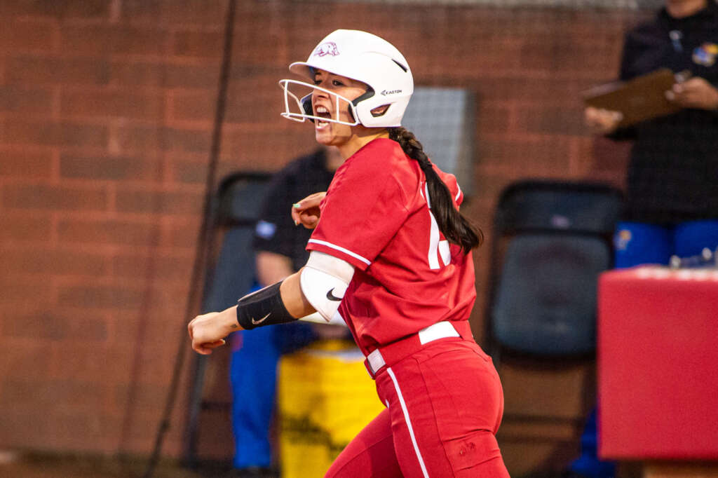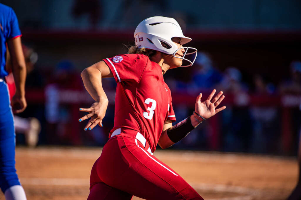 Redshirt freshman pinch runner Larissa Cessena charged home from second to score the game's tying run, narrowly beating the tag of the Kansas catcher.
