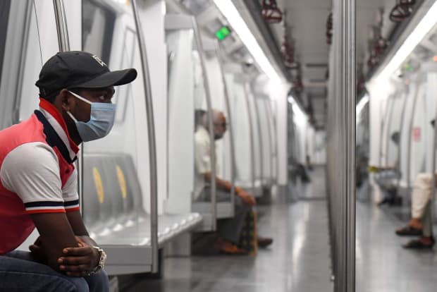 TOPSHOT - Commuters sit in a carriage of a Yellow Line train after Delhi Metro Rail Corporation (DMRC) resumed services following its closure due to the Covid-19 Coronavirus pandemic in New Delhi on September 7, 2020.