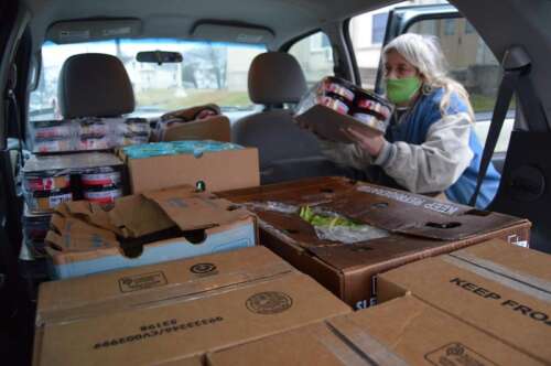 Rose Keppel of Lansford fills her vehicle with food donations which will be taken to families around Carbon County. CHRIS REBER/TIMES NEWS