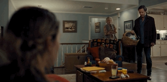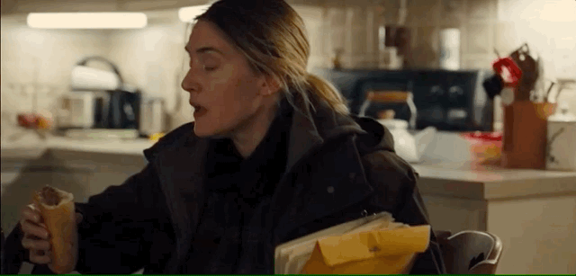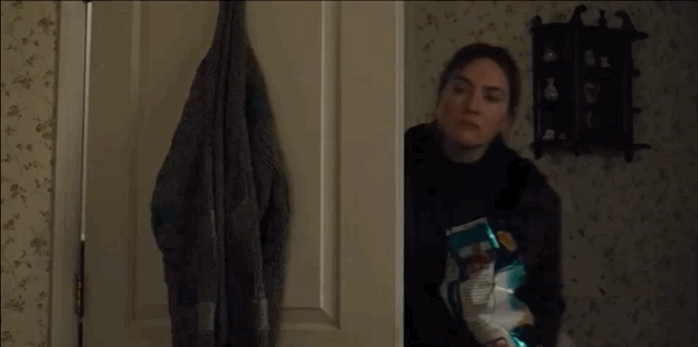At the end of the episode, having fled that stuffy, duck liver–peddling party, Mare, starving, stops at a gas station and picks up a more suitable dinner: a hefty hoagie. But as she’s checking out, she is also being stalked by the father of Brianna Delrasso (Mackenzie Lansing), whom Mare arrested earlier in the episode for having assaulted Erin on-camera. Mare makes it home, plops down on the couch, and prepares to, finally, eat a damn sandwich in peace. And then a jug of milk flies through her window, courtesy of Mr. Delrasso, sending shards of glass flying; through the room, into Mare’s hair and, most distressingly, onto the sandwich.