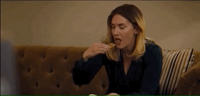 In sharp contrast to Mare wolfing down cheesesteak in her own kitchen, later that same episode, she begrudgingly accepts an invitation to her recent sex partner Richard’s book party. (This is also the first time we see Mare attempt whatever her version of “glamour” would be and — surprise! — she looks a lot like the beautiful actress Kate Winslet.) She’s clearly uncomfortable at the party, as she sits alone off to the side. When a waiter comes by and extends a duck-liver hors d’oeuvres, she accepts, placing the amuse-bouche into her mouth. It is, let’s say, incompatible with her palette, so she spits it out before slyly (?) sliding the chewed up appetizer into a couch cushion.