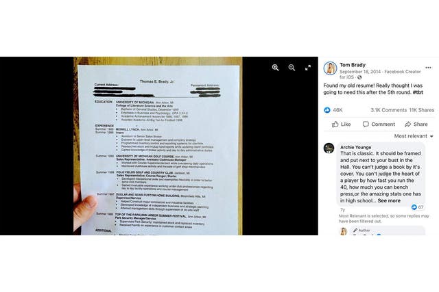 Fine also was still helping Brady at home, and the two jobs fed off of each other. One day in 2014, Fine was cleaning out Brady’s basement. Rawitz was helping him sort through boxes, and they found Brady’s college résumé in one of them. Fine knew fans would love to see the document Brady would’ve sent to employers if the Patriots hadn’t chosen him in the sixth round of the 2000 NFL Draft.